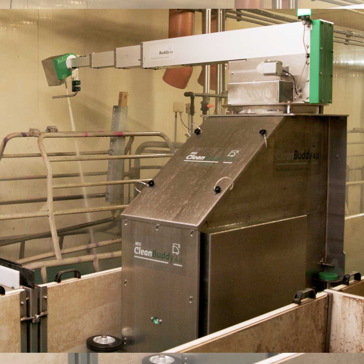De Cleanbuddy 4.0 meet automatisch de diepte van de stal en past de telescopische arm, rijsnelheid & hogedrukspuit daarop aan. De radarsensoren detecteren obstakels zoals voederbuizen of waterleidingen, waarna de sproeiarm automatisch ontwijkt. De wasarm beweegt in meerdere posities waardoor de wanden vanuit verschillende hoeken grondig worden gereinigd.